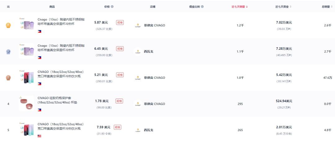 一說到保溫杯,大家第一反應就是裝熱水,但既是“保溫”杯,無論冷熱自然都是能夠保持溫度的。保溫杯品牌CIVAGO便是抓住了這一關鍵點,從“保冷”角度切入東南亞市場,做出了年GMV1200萬美元的記錄。而從近期來看,產品銷量也是相當可觀,據超店有數數據顯示,菲律賓?CIVAGO一款售價5.87美元的水杯,近7天售出了上千件。