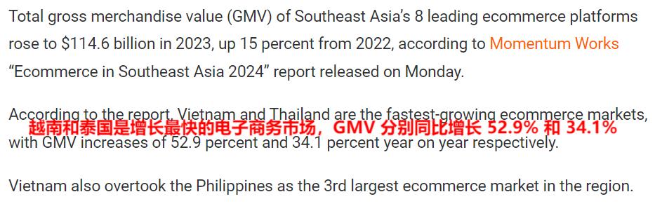 根據新加坡市場研究公司Momentum Works今年7月發布的《2024年東南亞電子商務報告》,在過去一年里,越南是東南亞地區增長最快的電商市場,GMV同比增長52.9%,同時,越南還超越了菲律賓,成為該地區第三大電商市場,僅次于印尼和泰國。