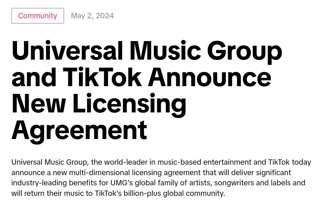 今年5月2日,TikTok與環(huán)球音樂集團(tuán)共同宣布,雙方達(dá)成新的版權(quán)許可協(xié)議。闊別三個月后,環(huán)球音樂旗下的錄制音樂和詞曲版權(quán)庫將重返TikTok平臺,TikTok用戶將能夠再次使用其音樂創(chuàng)作視頻。