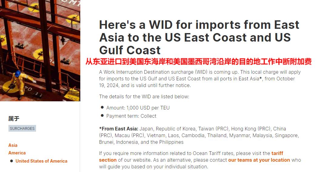 赫伯羅特的收費(fèi)新政則是自2024年10月19日起,對(duì)從東亞港口運(yùn)往美國海灣及東海岸的所有貨物征收目的港中斷附加費(fèi),收費(fèi)標(biāo)準(zhǔn)為1000美元/TEU。