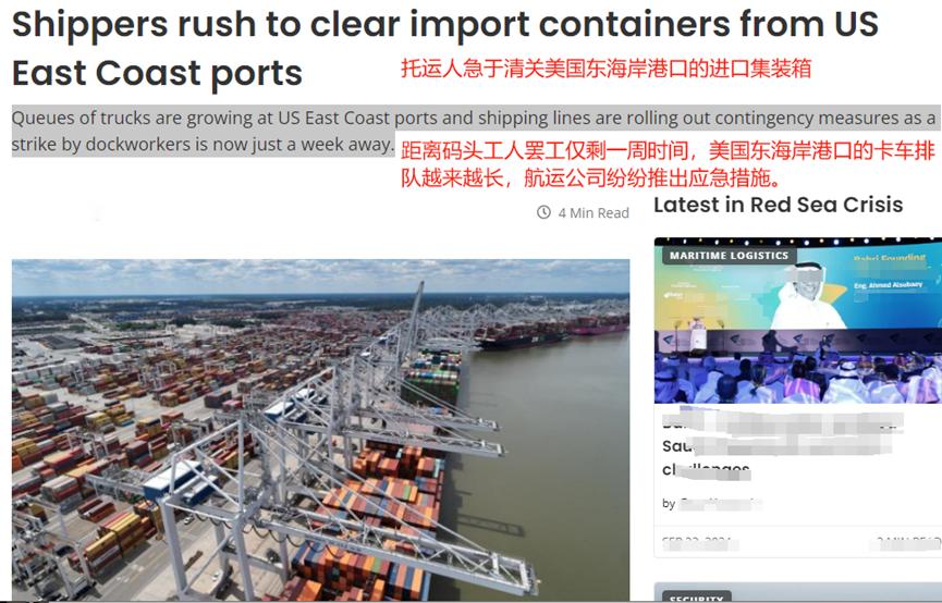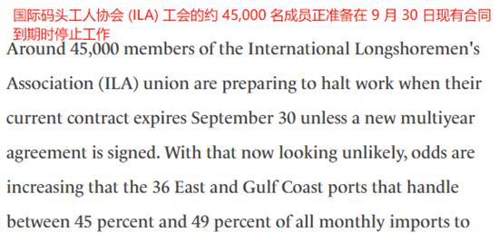 9月23日,ILA宣布,如果在9月30日前雙方未能達(dá)成協(xié)議,將聯(lián)合紐約、休斯頓、邁阿密、薩凡納等主要港口的45000名工人舉行罷工。