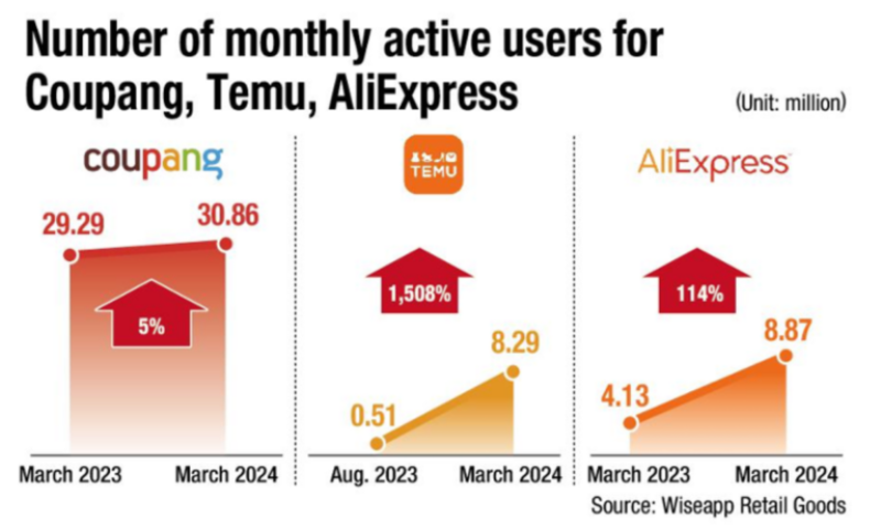 一方面,以速賣通、Temu為代表的中國跨境電商平臺擴張速度兇猛,兩者都在商品價格方面占據重要優勢,以低價策略吸引了不少韓國消費者的注意。