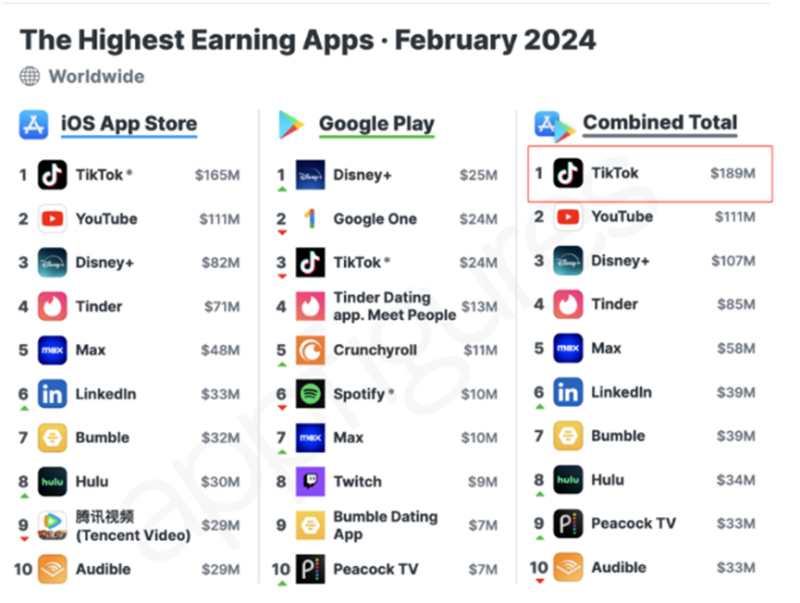 TikTok全球收入最高 圖源:Appfigures