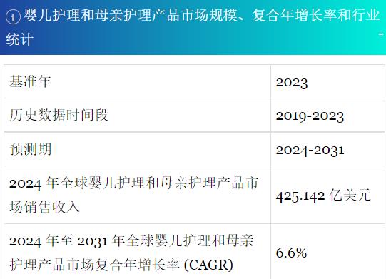 來(lái)自Cognitive Market Research發(fā)布的數(shù)據(jù)顯示,就母嬰護(hù)理產(chǎn)品全球市場(chǎng)規(guī)模而言,2024年就能達(dá)到425.142億美元,這一數(shù)字預(yù)計(jì)在2024年到2031年期間以6.6%的復(fù)合年增長(zhǎng)率保持增長(zhǎng)。更不用說(shuō)整個(gè)母嬰市場(chǎng)了,有數(shù)據(jù)表明,全球母嬰市場(chǎng)規(guī)模預(yù)計(jì)到2027年突破萬(wàn)億美元大關(guān),達(dá)到驚人的1.4萬(wàn)億美元。