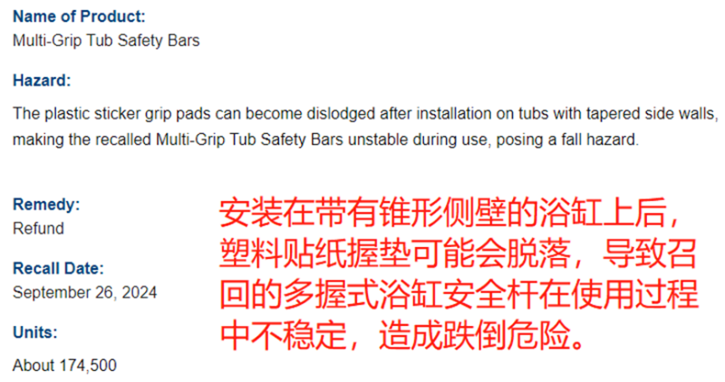 比如近日,據(jù)媒體報(bào)道,美國(guó)消費(fèi)品安全委員會(huì)(CPSC)宣布緊急召回Liberty Hardware旗下多款存在安全隱患浴缸安全扶手,建議已購(gòu)買(mǎi)的消費(fèi)者立即停止使用,并聯(lián)系品牌方和平臺(tái),以妥善處理退貨和獲得退款。