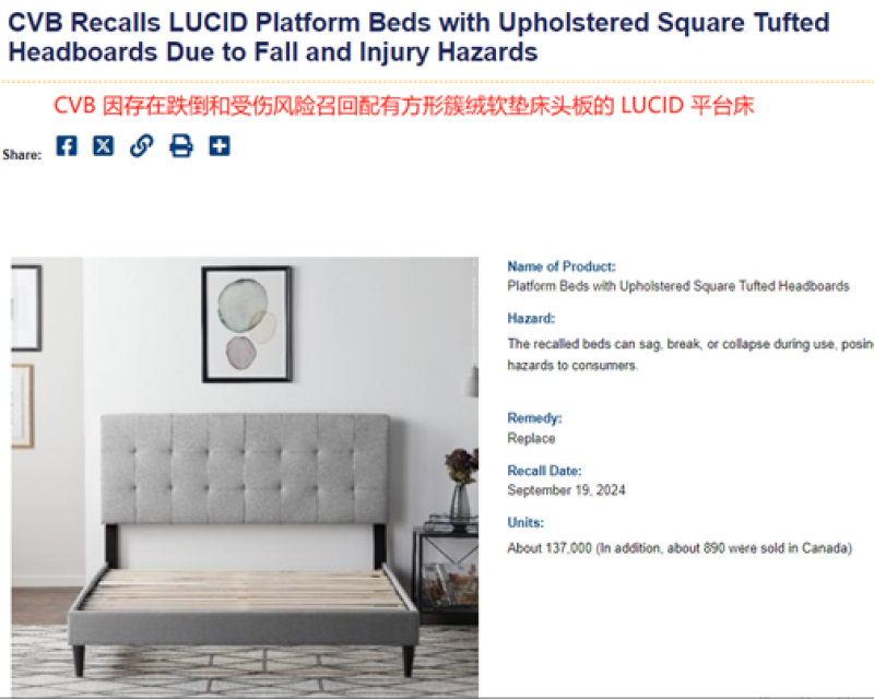 前幾天,美國(guó)消費(fèi)品安全委員會(huì)(CPSC)緊急召回Lucid品牌旗下一款平板床。據(jù)了解,該款產(chǎn)品帶有方形簇絨軟墊床頭板,顏色多樣,在亞馬遜、沃爾瑪、eBay等各大平臺(tái)均有出售。截止今年4月,該款產(chǎn)品的總銷(xiāo)量已經(jīng)接近14萬(wàn),不可謂不驚人。而這種暢銷(xiāo)產(chǎn)品之所以會(huì)被召回,就是因?yàn)樗谑褂眠^(guò)程中可能會(huì)破裂、塌陷,進(jìn)而對(duì)消費(fèi)者造成人身傷害。