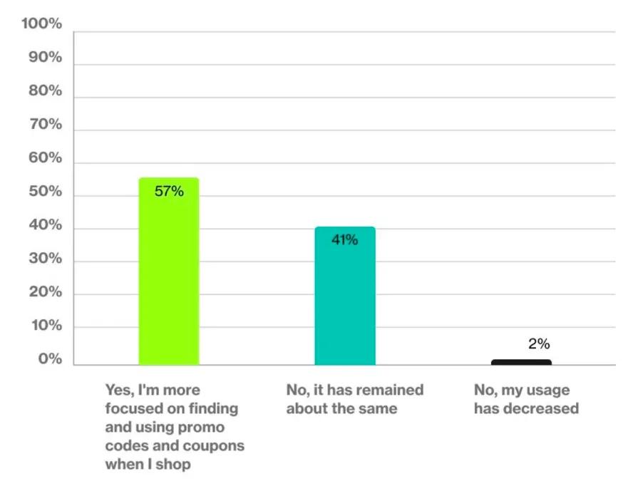 據此前Simply Codes的一份研究顯示,在過去一年,有57%的美國消費者增加了促銷代碼、折扣或優惠券的使用,有62%的消費者會在網購時積極尋找并使用折扣碼,與此同時,有83%的消費者表示,未來在網購時還將更頻繁地使用折扣碼。