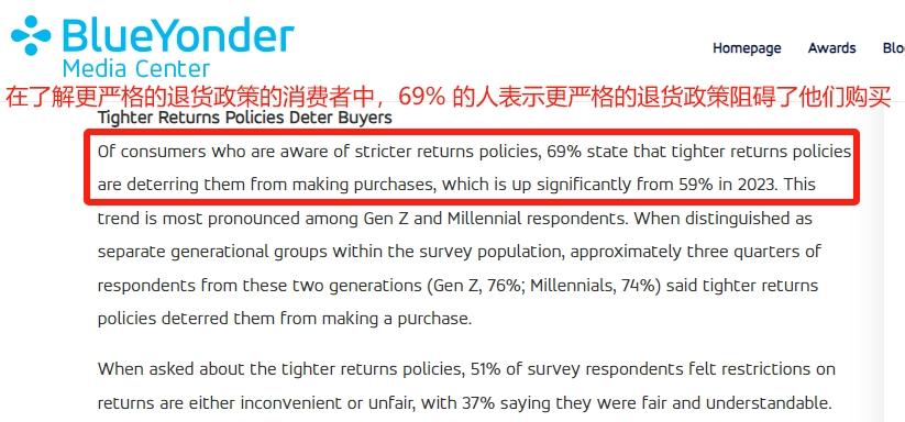 近日,數字供應鏈轉型領域的全球領導者?Blue Yonder發布了其 2024 年消費者零售退貨調查的結果,調查結果顯示,91% 的受訪者表示寬松的退貨政策會影響他們的購買決策,隨著退貨政策變得嚴格,69%的受訪者表示這阻礙了他們購買,這一數字相較2023年的59%有大幅上升。