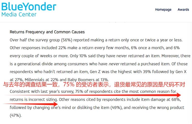 另外,從受訪者的退貨原因上來說,有75% 的消費者表示,退貨最常見的原因是尺碼不對,緊隨其后的是商品損壞(68%)、改變主意或不喜歡商品(49%)、收到錯誤商品(47%)等。