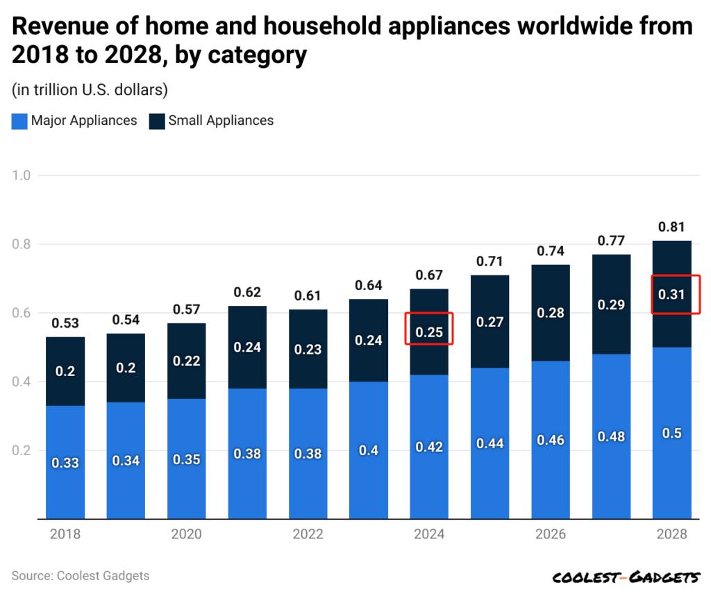 據(jù)Statista數(shù)據(jù)顯示,全球小家電市場規(guī)模預計將在未來幾年內(nèi)持續(xù)擴大。到2024年,這一市場規(guī)模將達到2543億美元,并預計在未來四年內(nèi)以4.65%的年復合增長率持續(xù)增長,至2028年市場規(guī)模將增至3100億美元。其中,美國作為小家電市場的領(lǐng)頭羊,其市場規(guī)模預計在2024年將達到301.9億美元;東南亞市場的表現(xiàn)也不俗,預計到2024年市場收入將達到168.8億美元。