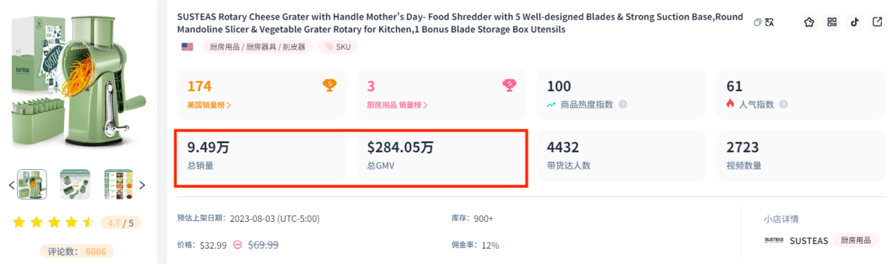 在此之前,這款切菜機在TikTok上也一直保持著較高的熱度,從去年八月初上架至今,總銷量已達9.49萬件,總銷售額超280萬美金;在最新的廚房用品類銷量榜中,這款切菜機以突出的銷售成績位列第三。