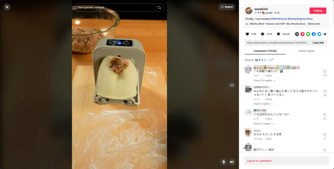 因為最初,自動包餃子機就是被一位博主@suzaki65的花樣“翻車”視頻帶火的,這位博主原本打算記錄包餃子機的操作過程,沒想到竟怎么也摸不著包餃子機的正確打開方式,各種失誤操作給海外網(wǎng)友帶來了極大樂趣。