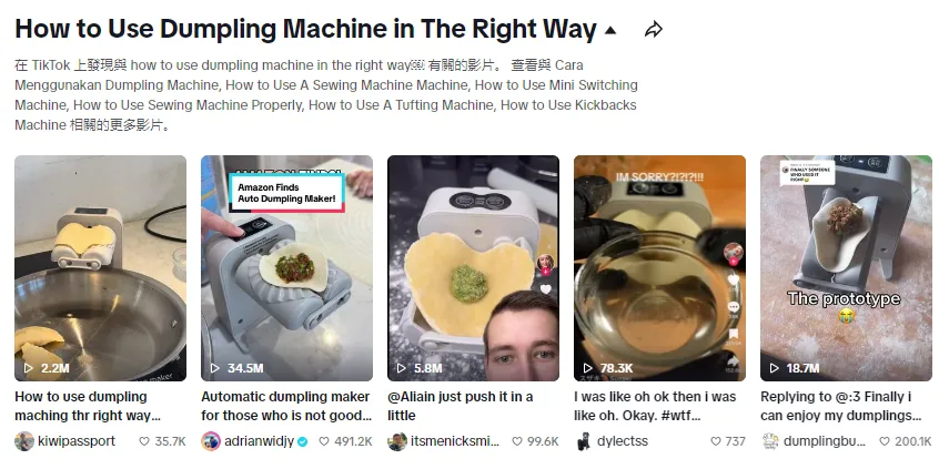 短短一個月時間,這條視頻就獲得超2億次的播放量,點贊數(shù)高達900萬,一舉將自動包餃子機推到了TikTok頂流的位置;不少用戶因為包餃子機的“搞笑表演”,紛紛加入包餃子挑戰(zhàn),TikTok上關(guān)于“如何做餃子”“如何正確使用餃子機”話題也一度引發(fā)熱烈討論,相關(guān)帖子內(nèi)容達到數(shù)億條。