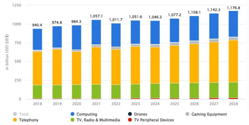 一份來自Statista的數據證明了當今消費電子市場的火熱,它顯示:2024年,全球消費電子市場的年收入預計將達到1.046萬億美元,其中線上銷售額占比為33.5%。未來幾年,這一市場還將持續增長,到2028年時,其規?;驅⑦_到1.177萬億美元。