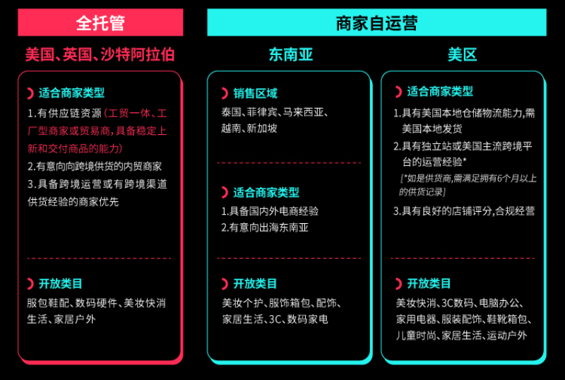 截止目前,TikTok Shop全托管已開放國家:美國、沙特阿拉伯、英國,其他國家正在陸續(xù)開放中。