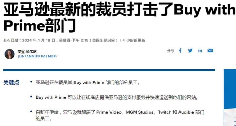 今年年初,亞馬遜又在其核心的Buy with Prime部門開啟了裁員,宣布將裁掉該部門差不多5%的員工。差不多是同一時間,亞馬遜其他部門也有廣泛的裁員動作,包括會員視頻部門Prime Video、米高梅工作室MGM Studios、直播平臺Twitch和有聲讀物平臺Audible等部門的員工都受到了裁員潮的影響。