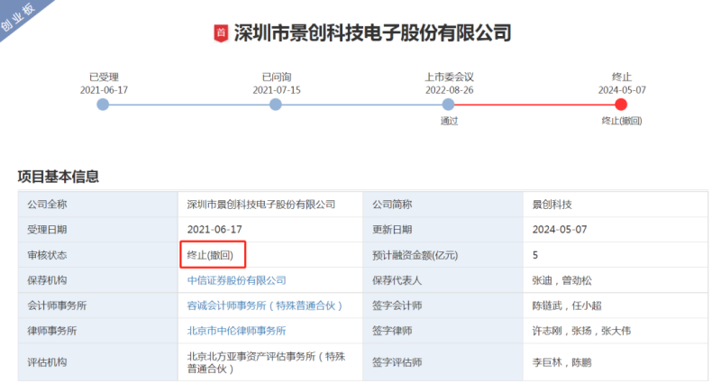 根據深圳證券交易所發布的公告稱,因發行人、保薦人撤回發行上市申請,根據《深圳證券交易所股票發行上市審核規則》第六十二條,本所終止深圳市景創科技電子股份有限公司(以下簡稱“景創科技”)發行上市審核。