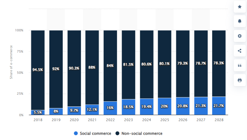 Statista數據指出,當前,社交電商對整個電商市場的重要性正與日俱增。2023年,通過社交平臺進行的銷售約占在線銷售總額的18.5%;預計未來數年內,全球社交電商規模還將穩步增長,收入占比突破20%。