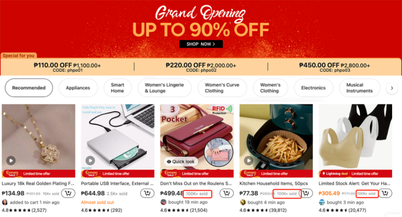 部分商品銷量10萬+ 圖源:Temu菲律賓站首頁