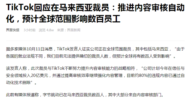 文章來源于互聯(lián)網(wǎng):TikTok回應(yīng)裁員:預(yù)計(jì)全球范圍影響數(shù)百名員工
