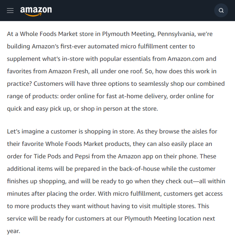 此外,亞馬遜還在賓夕法尼亞州普利茅斯的一家Whole Foods Market商店中,建造其首個自動化微型配送中心,進一步縮短運輸時間并降低配送成本。該配送中心將為客戶提供亞馬遜商城和Amazon Fresh熱門產品,顧客可以選擇送貨上門、在線下單自取或到店購買。