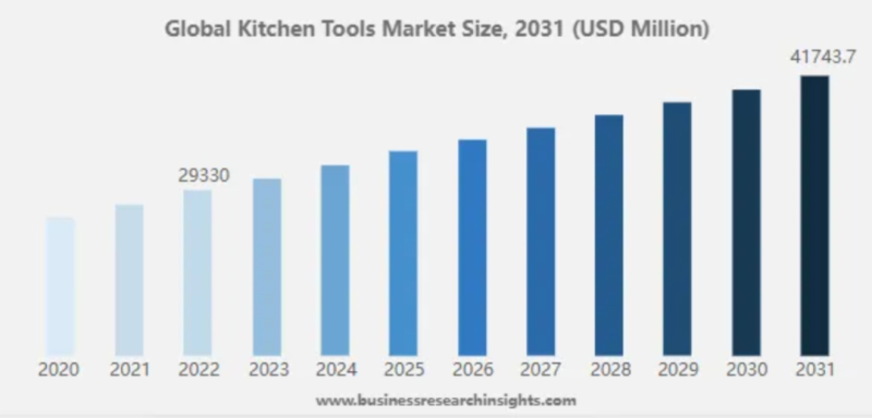 需求的上漲帶動行業(yè)的變化,據(jù)businessresearchinsights數(shù)據(jù)顯示,2022年全球廚房工具市場規(guī)模將達到 293.3億美元,預測期內復合年增長率為4.0%,而到2031年,這一數(shù)據(jù)將達到417.437億美元,有了巨大的增長。