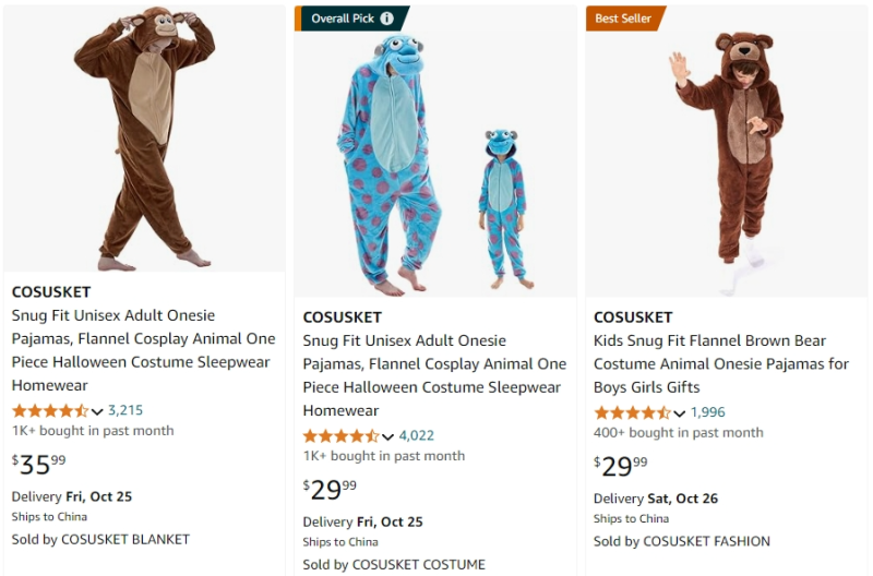 據FindNiche選品數據庫顯示,近日,亞馬遜上一款售價29.99美金的動物睡衣銷量節節走高,近30天BSR漲幅超過3000%,月銷量超2.2萬件,很多消費者都購買了這一產品,迎接即將到來的萬圣節。