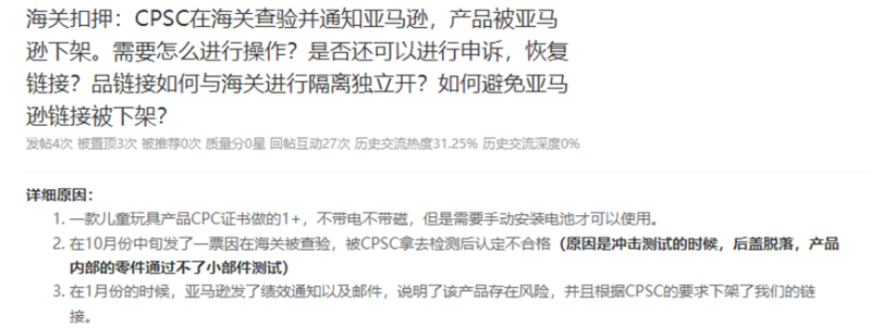 事實(shí)上,美國(guó)海關(guān)查貨的情況時(shí)有發(fā)生,此前就有許多賣家受到了影響。比如今年一位賣家在論壇發(fā)帖求助,稱自己的產(chǎn)品在海關(guān)被查驗(yàn),后被CPSC(美國(guó)消費(fèi)品安全委員會(huì))查驗(yàn)而沒有通過測(cè)試,商品鏈接因此被下架。