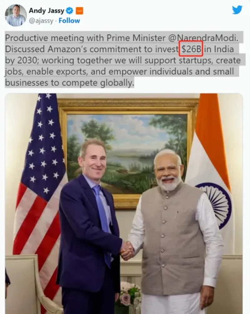 在這片肥沃的電商熱土上,亞馬遜頻頻砸錢。去年6月,亞馬遜首席執行官Andy Jassy就承諾,公司將在印度追加150億美元投資,到2023年其在印度的總投資額高達260億美元。除了亞馬遜,老對手沃爾瑪也不甘示弱,其對子公司Flipkart的投資金額接近200億美元。