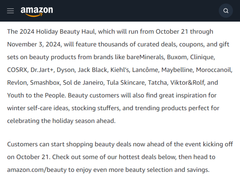 文章來源于互聯網:亞馬遜第四屆假日美容大促將于10月21日啟動
