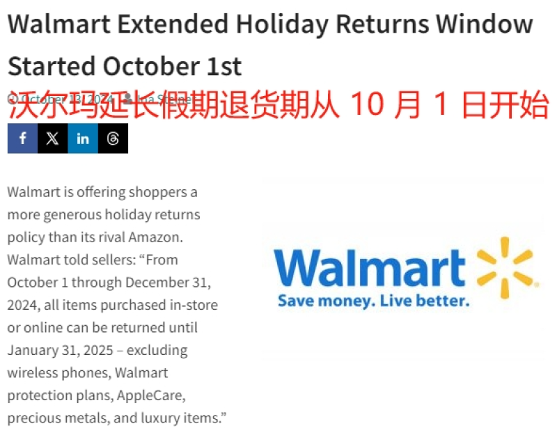 與此同時,沃爾瑪同樣選擇也在假日季期間提供延期退貨服務:2024年10月1日至12月31日,除了無線電話、沃爾瑪保護計劃、AppleCare、貴重金屬以及特定奢侈商品,其他所有在沃爾瑪門店內或網站上購買的商品,都可以在2025年1月31日前退回。