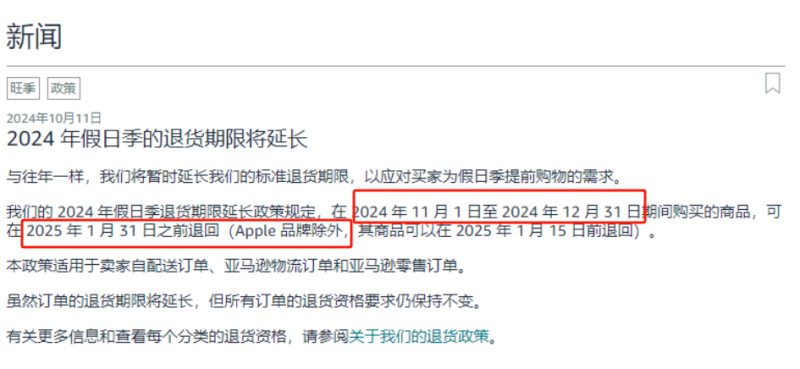 首先來看亞馬遜,據亞馬遜最新公告,2024年11月1日至2024年12月31日期間購買的商品,均可以在2025年1月31日之前退貨,其中Apple品牌產品退貨期限為2025年1月15日,該政策適用于賣家配送、FBA和亞馬遜零售訂單。