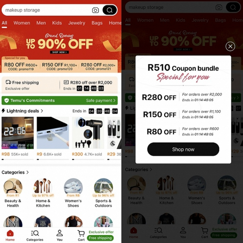 以Temu為例,在南非上線后,同樣使用了其“王牌殺手锏”,多數商品價格保持在10蘭特到300蘭特之間,憑借大額優惠券滿減、包郵、超多低價商品等迅速吸引了一波消費者。