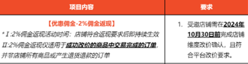 具體來說,Shopee將對所選高客單價商品的傭金從10%下調至8%(即2%傭金返現),前提是受邀店鋪需在10月30日前完成店鋪維度的改價確認,并符合平臺的改價要求。一旦以上條件均滿足,傭金返現將立即生效。需要注意的是,2%傭金返現活動不適用于產生退貨退款的訂單。