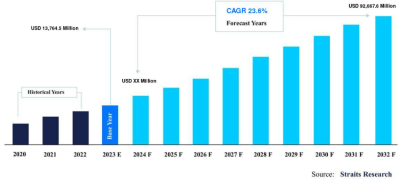 有數據顯示,2021年,海外清潔電器銷量為7700萬臺,同比上漲13%,到2027年,全球掃地機的市場容量將增至2320萬臺。此外,來自Straits Research發布的一份報告顯示,2023年,全球清潔機器人市場規模為137.645億美元,這一數字預計到2032年將達到926.679億美元,預測期內(2024-2032年)的復合年增長率為23.6%。