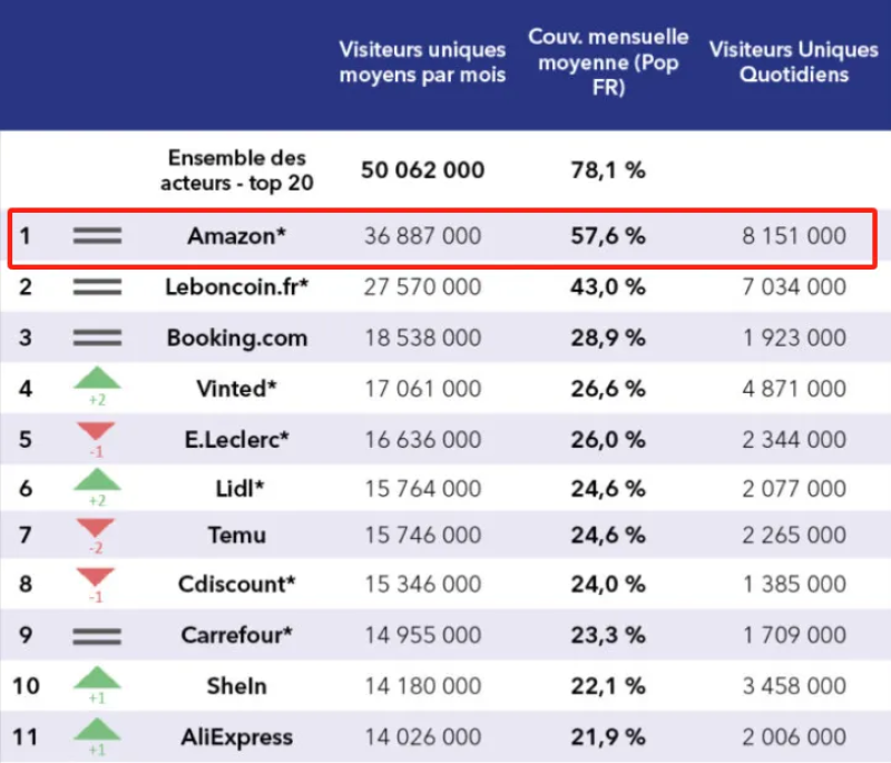 此前,Fevad發布了2024年第二季度電商平臺訪問情況報告,數據顯示,在眾多電商平臺中,亞馬遜可以說是遙遙領先,月獨立訪客數達到3680萬,吸引了57.6%的法國人口,平均每天訪客數高達810萬。