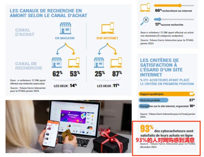 此前,法國電商銷售聯合會(Fevad)發布了一項研究報告,報告顯示,有93%的法國人表示對網購所帶來的生活方式感到滿意,豐富的產品選擇、有效節省購物時間等優勢,都使他們的日常生活更加便利。