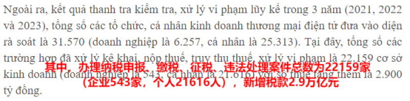 越南財(cái)政部此前公布數(shù)據(jù),2021-2023年間,越南政府累計(jì)對(duì)31570個(gè)從事電商活動(dòng)的組織和個(gè)人進(jìn)行了稅務(wù)審查,其中,沒有合規(guī)繳稅而被處理的企業(yè)和個(gè)人多達(dá)22159家。