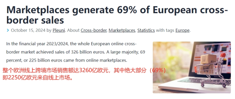 此前,研究機構CBCommerce.eu公布了《歐洲100強跨境市場》報告,據報告顯示,在2023-2024財年,整個歐洲跨境電商市場銷售額達3260億歐元,其中的69%,也就是2250億歐元都來自線上市場。
