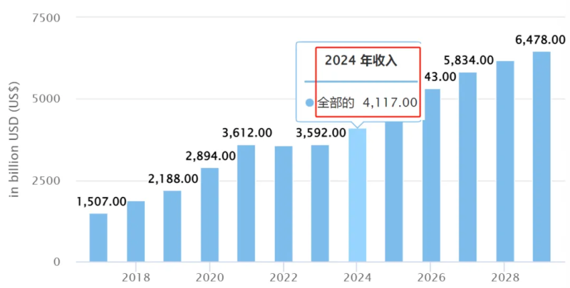 此前,有機構(gòu)發(fā)布了一份《2024年至2028年全球零售電商預測報告》,其中指出,全球電商銷售總額預計將從2023年的4.4萬億美元飆升至至2028年的6.8萬億美元,預測期內(nèi)復合年增長率(CAGR)將達到8.9%。除了電商總體銷售額的上漲,電商市場的價值也節(jié)節(jié)攀升,來自Statista的數(shù)據(jù)顯示,2024年電商市場收入預計達到4.117萬億美元,未來幾年保持增長。
