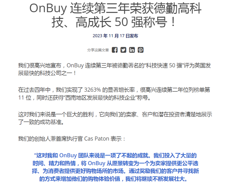 對于賣家來說,OnBuy其實是一個值得布局的藍海平臺。2023年,OnBuy在FT1000榜單中,還連續(xù)三年上榜德勤高科技高成長50強。此外,OnBuy還不斷優(yōu)化一系列包括付款、配送、客戶服務(wù)等在內(nèi)的平臺服務(wù),使得賣家能夠在這個平臺上更加便捷地開展業(yè)務(wù)。