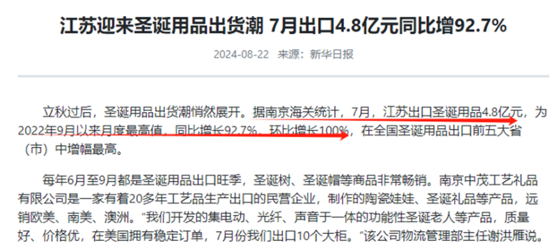 當(dāng)然,不僅僅是德國,海外許多國家的消費(fèi)者都提前進(jìn)行圣誕購物,使得我國許多銷售圣誕相關(guān)商品的跨境賣家已經(jīng)實(shí)現(xiàn)了爆單,銷售和營收節(jié)節(jié)攀升。一份來自南京海關(guān)的數(shù)據(jù)就顯示,今年前7個(gè)月,江蘇省出口圣誕用品的總金額達(dá)到了9.3億元,同比增長33.9%。這其中,僅7月的出口額就有4.8億元,同比暴漲了將近一倍。