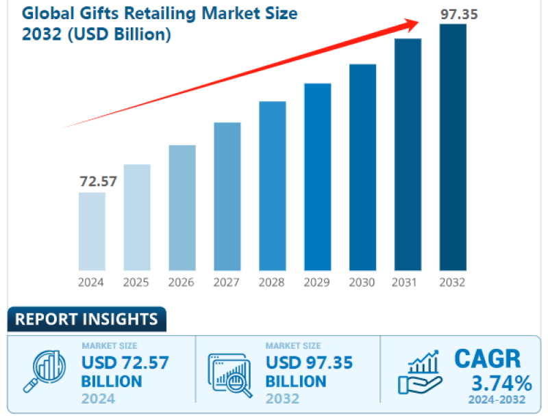 隨著消費者可支配收入的增加,禮物消費更是不再局限于傳統節日或特定場合,而是成為日常生活中表達情感、傳遞祝福的重要方式。在這樣的背景之下,跨境電商賣家迎來了一個重要商機。來自Business Research Insights發布的數據也顯示,2024年全球禮品零售市場規模為725.7億美元,這一數字到2032年預計能夠達到973.5億美元,預測期內復合年增長率為3.74%。
