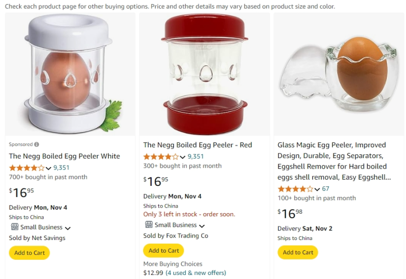 這種省時省力的優點讓該產品逐漸成為廚房必備品,許多類似的產品也開始在平臺中涌現,例如在亞馬遜中搜索剝蛋器相關關鍵詞,就能看到不少同款設計的產品,并且有些產品的銷售額也不低,一個月能賣出近萬件。