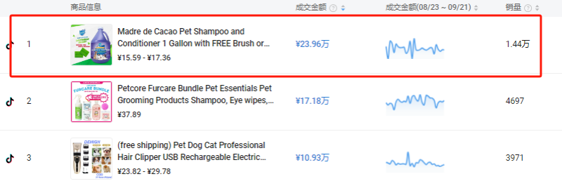 上個月,一款狗狗洗發水憑借方便省事、洗護功效合一等優點,在TikTok菲律賓一炮而紅,它就是“Vunguard Madre de Cacao”。據Kalodata的數據顯示,在8月23日至9月21日的一個月時間內,這款洗發水共賣出1.44萬件,累計成交額高達23.96萬元,沖上TikTok菲律賓地區銷量第一。?