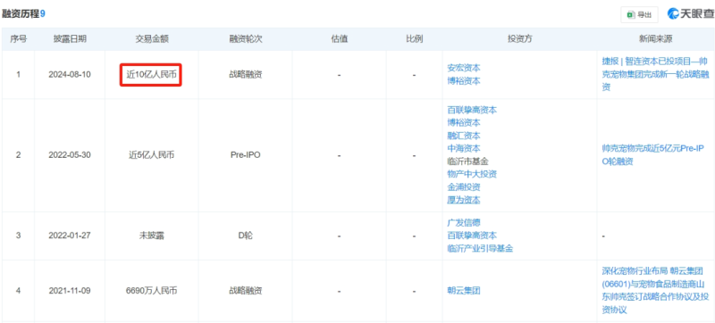 今年8月,山東帥克寵物用品股份有限公司收獲了今年寵物賽道上最大的一筆投資:近10億人民幣。實際上,帥克寵物一直很受資本的青睞,自2017年以來,其共計獲得9輪融資,光是在已披露交易金額的3輪融資中,就已經達到15.67億元,可以說表現相當亮眼。?