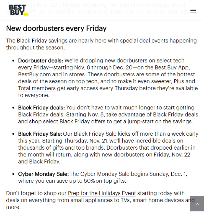 同時,百思買黑五大促(Black Friday Sale)將比往年提前一周多開始,從11月21日星期四開始,將以超值優惠提供數千種禮品和頂級品牌,還將在11月22日星期五和11月29日黑色星期五推出新的搶購活動。此外,網絡星期一大促于12月1日星期日開始,屆時客戶可以享受高達50%的折扣。