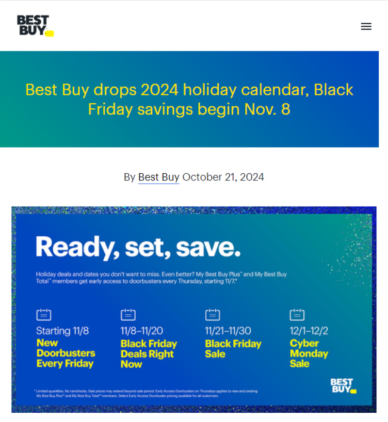 10月22日消息,美國零售巨頭百思買(Best Buy)公布完整的假日促銷活動時間表,與往年相比,今年的黑色星期五特惠(Black Friday deals)將提早到11月8日開始。11月8日起,顧客可參與黑色星期五特惠,在百思買官網、應用程序和線下門店選購精選商品。11月8日-12月20日的每周五,百思買還將推出精選科技新品搶購特惠,Plus和Total會員可提前一天參與,每周四享受優惠購買的機會。