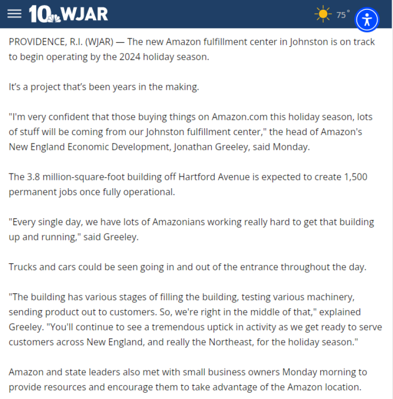 新配送中心位于哈特福德大道,總面積達380萬平方英尺,全面投入運營后預計將創造1500個永久性就業崗位。亞馬遜新英格蘭經濟發展部負責人喬納森·格里利(Jonathan Greeley)表示:“我非常有信心,這個假日季在亞馬遜上購物的顧客,很多商品都會來自我們的約翰斯頓配送中心。我們準備在節日期間為新英格蘭地區乃至東北部的客戶提供服務。”