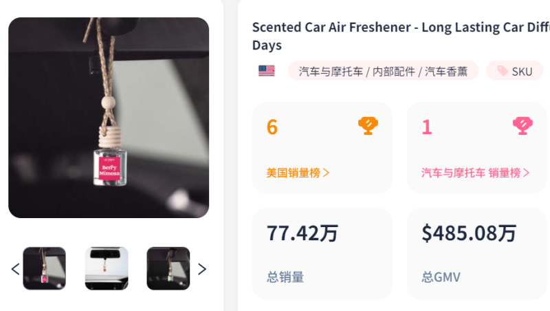 例如在TikTok美區,一款售價在5美元左右的懸掛式車載香薰,自去年6月上架以來,便持續爆單。截至目前,其總銷量已經突破77萬件,預估總銷售額達到485萬美金;在TikTok美區銷量榜及細分類目榜中,都是穩居前列。
